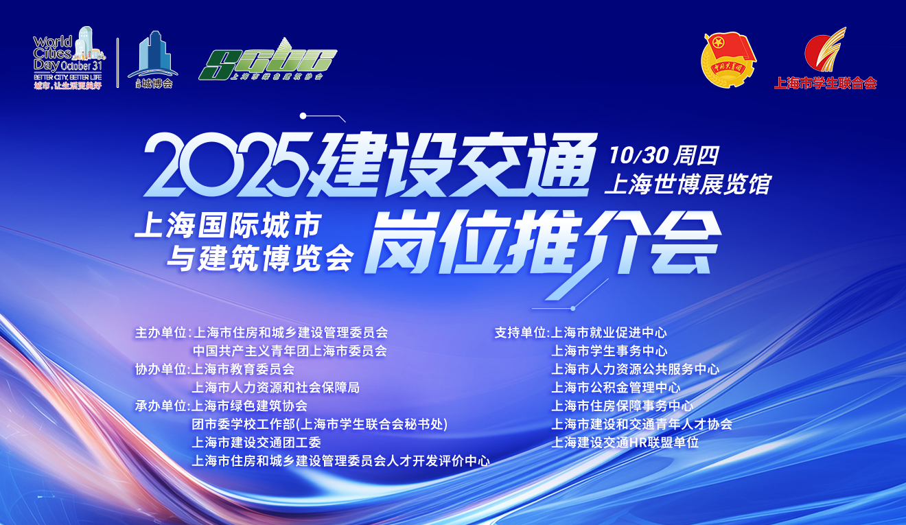 为全面贯彻落实党中央、国务院对就业创业工作的决策部署,促进人才在上海建设交通行业高质量充分就业,上海市绿色建筑协会、团市委学校工作部(上海市学生联合会秘书处)、上海市建设交通团工委、上海市住房和城乡建设管理委员会人才开发评价中心于10月30日(星期四)在上海世博展馆联合举办2025城博会“建设交通岗位推介会”。