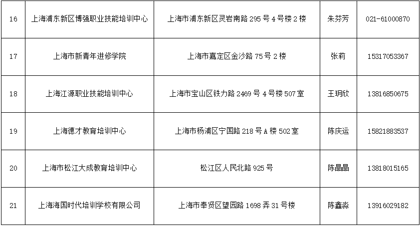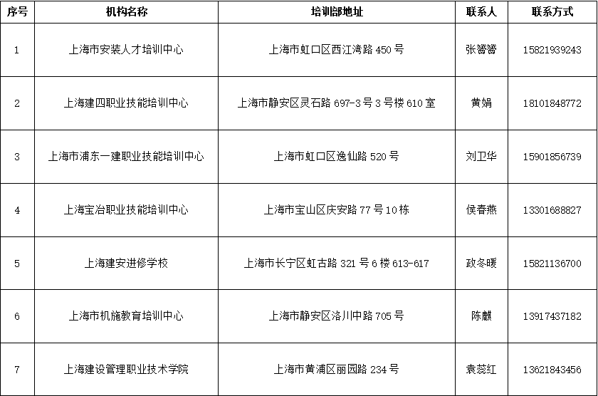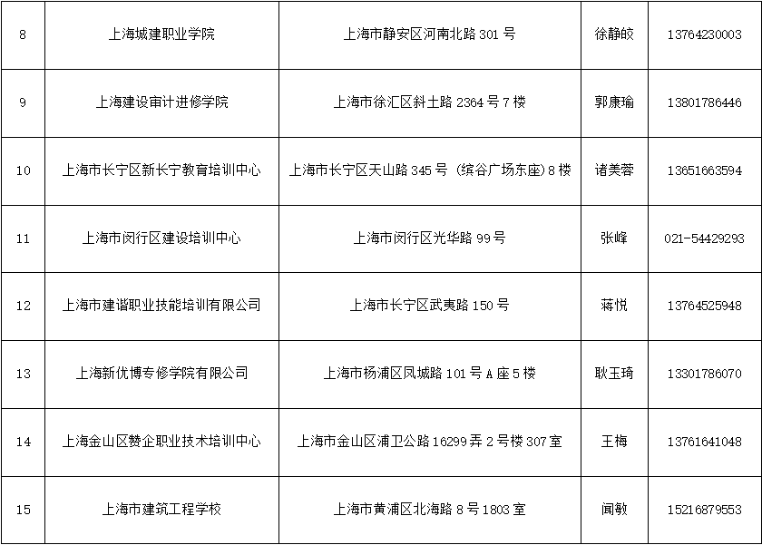 上海市住房和城乡建设领域施工现场专业人员培训机构名单