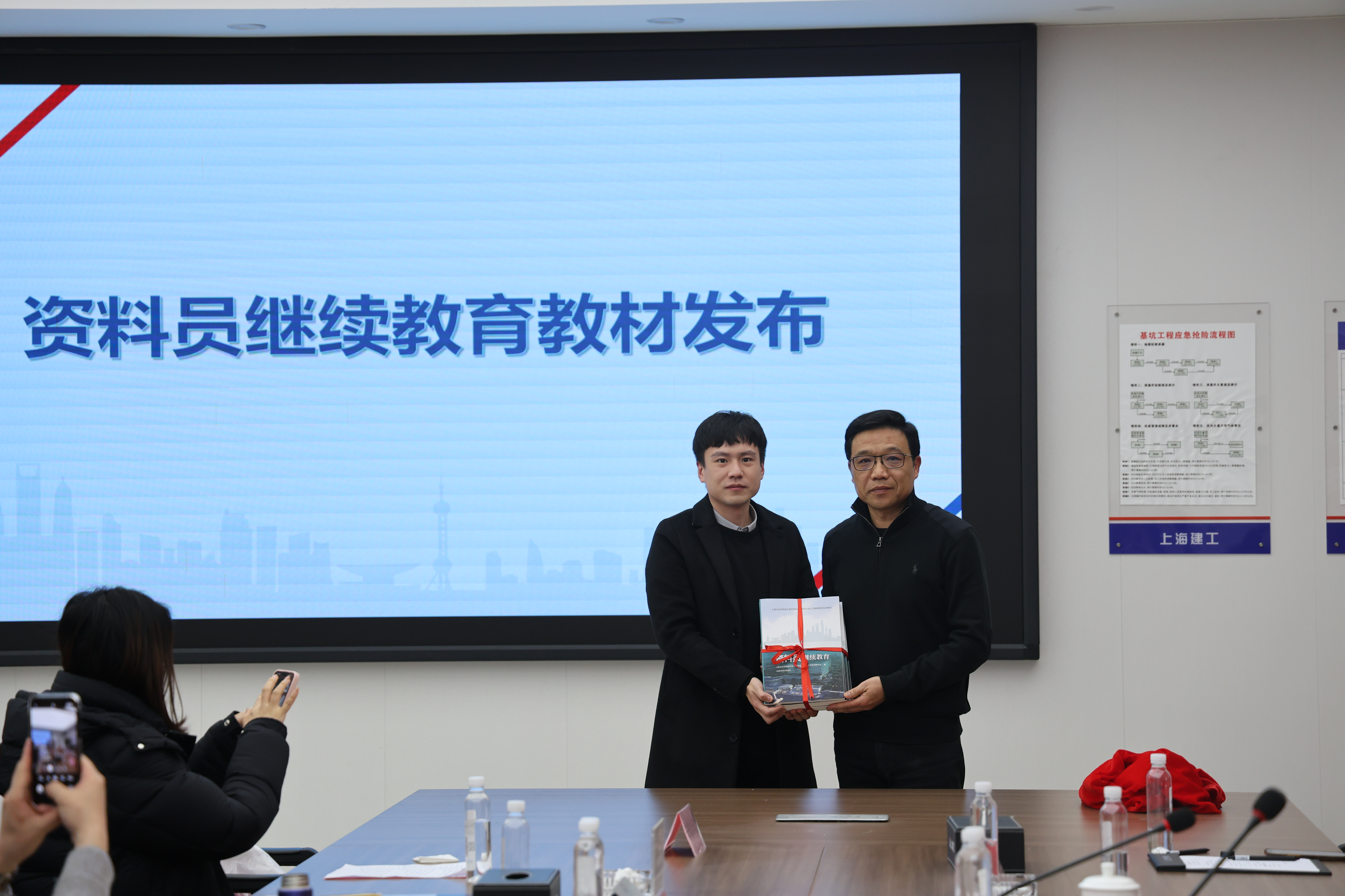 会上举行了《资料员继续教育》新书发布仪式,市住建委人才中心主任邵巍与安装人才培训中心校长助理张政共同为新书揭幕。
